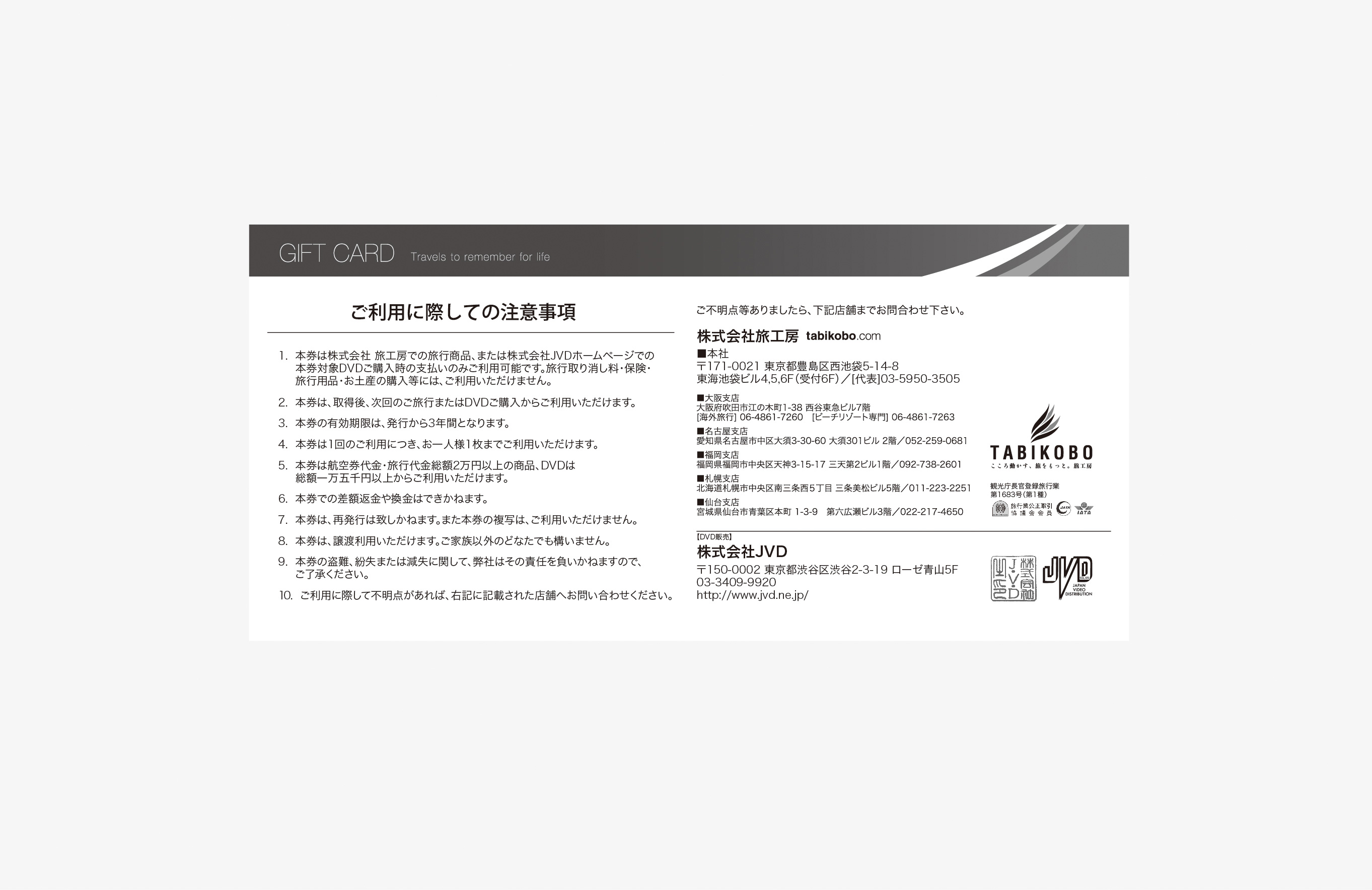 ●旅行会社 旅工房の航空券代金・旅行代金総額2万円以上の商品にご利用いただけます。DVD販売会社JVDでもご利用可能。